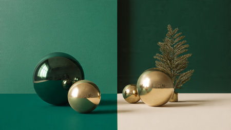 Minimalist emerald scene accented with polished champagne-gold holiday decorations for a sleek festive feel.