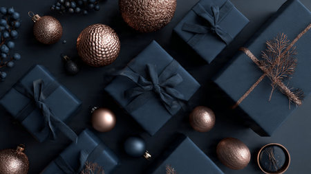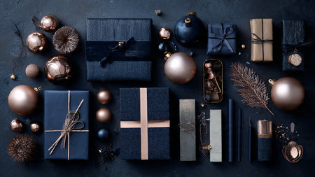 A high-end Christmas mockup with deep-blue packaging and rose-gold foil ribbons arranged with precision.