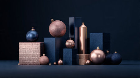 A soft-lit holiday mockup highlighting refined rose-gold ornaments arranged over deep blue tones.