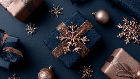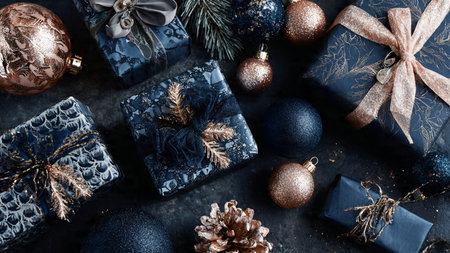 A set of luxury holiday gifts wrapped in deep blue tones and rose-gold foil ribbons.
