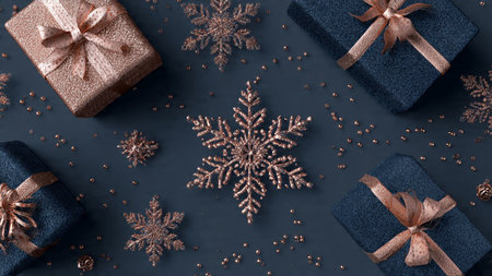 Artistic snowflake placement with a mix of rose-gold and blue accents.