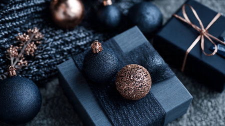 Christmas or New Year background with black gift, Christmas baubles over black background. black friday Greeting card. Copy space.