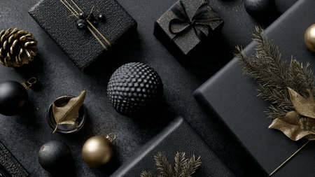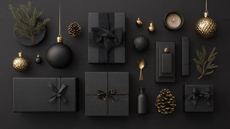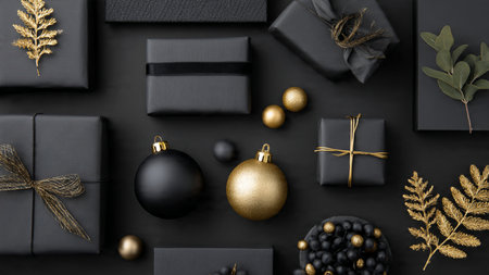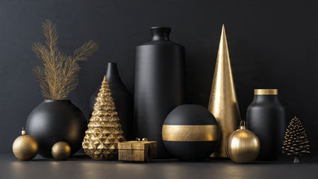 A stylish premium festive setup mixing matte-black surfaces with rich metallic gold details.