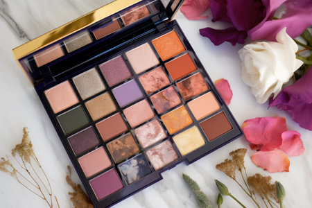 Cosmetics palette closeup with different colors, flatlay, Generative AI