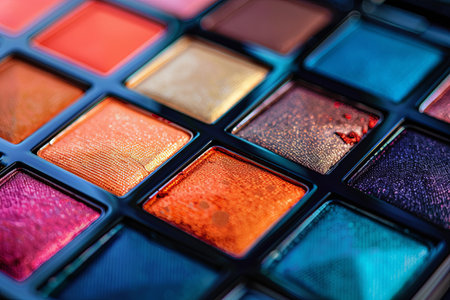 Detailed close-up of a vibrant eyeshadow palette with rich hues and visible texture.