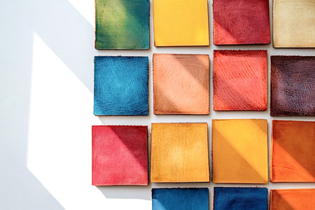 Multicolored leather swatches arranged on a white surface, showcasing diverse textures and hues, illuminated by natural light creating an abstract pattern