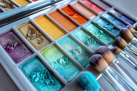Close-up of an open eyeshadow palette with vibrant shades, surrounded by makeup brushes on a clean white surface