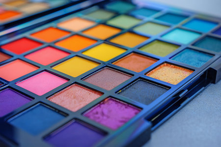 A high-detail close-up capturing the rich and varied hues of a multi-colored eyeshadow palette with a perfectly even surface texture.