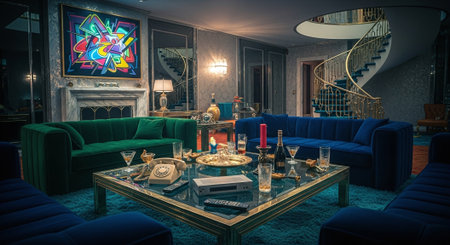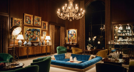 A luxurious living room featuring a blue sofa, elegant chandeliers, and art on the walls, with stylish furniture and decorative items