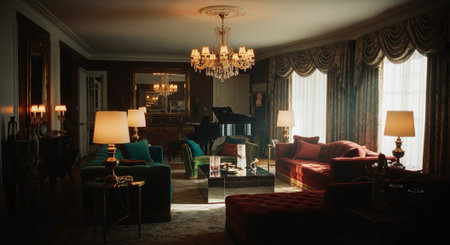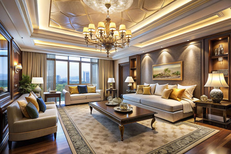 Elegant crystal chandelier in luxurious living room with classic decor and soft lighting. That the image is generated using AI.