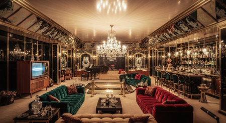 Luxurious living room with grand crystal chandelier and elegant decor. That the image is generated using AI.