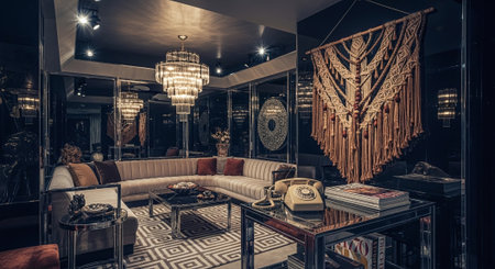 A stylish and modern living room featuring a curved sofa, elegant chandelier, decorative wall hangings, and a chic coffee table