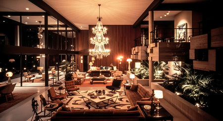A luxurious modern living room with a large chandelier and high ceilings at night