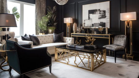 Interior of classic living room with black walls, black sofa, gold armchairs, round coffee table and gold lamps. 3d rendering