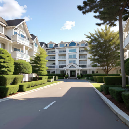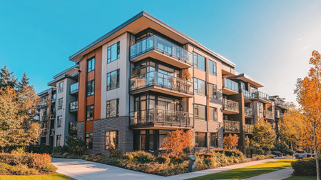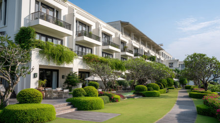Elegant luxury condominium exterior with landscaped surroundings, comfort. generated by ai