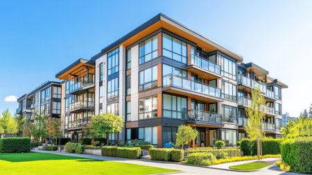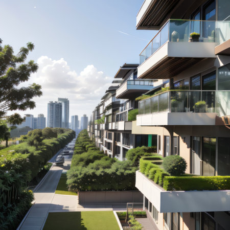 A modern apartment building drenched in bright sunlight, showcasing sleek architecture and greenery. Perfect for promoting contemporary urban living and lifestyle.