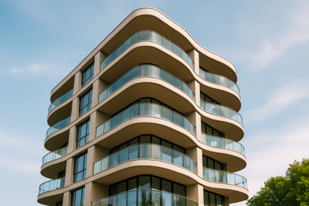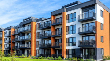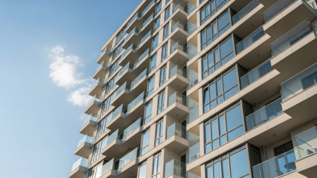 A stunning modern apartment building featuring multiple balconies and a vibrant facade, set against a clear blue sky, embodying contemporary urban living.