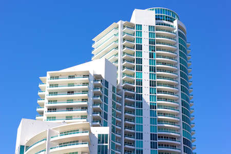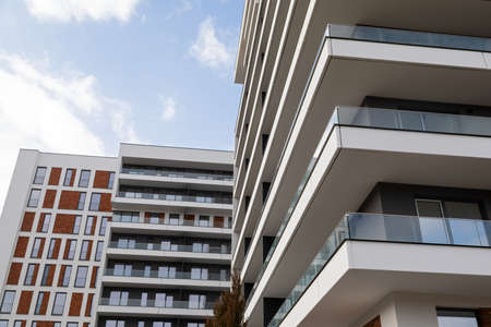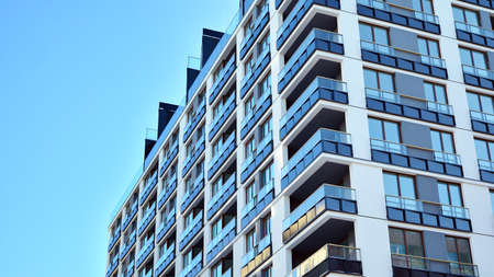 Fragment of a modern residential exterior of an apartment building. View of urban real estate and condo architecture. blue sky