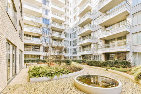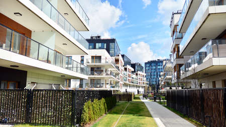 Modern residential apartment with flat buildings exterior with outdoor facilities. New luxury house and home complex and green yard. City Real estate property and condo architectur