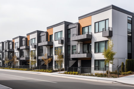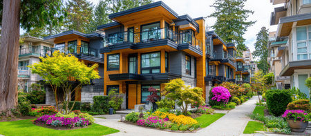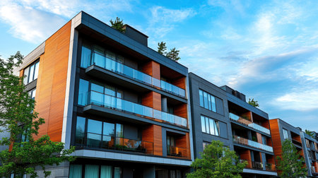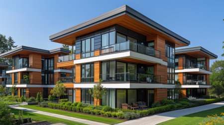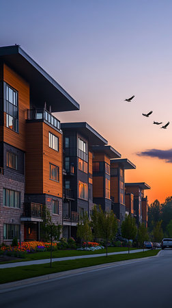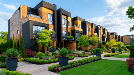 This image features modern residential buildings showcasing clean lines and contemporary architecture set against a picturesque suburban backdrop.