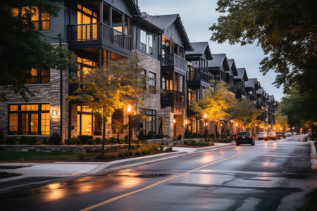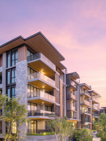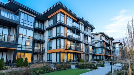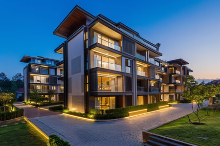 This image showcases a contemporary luxury apartment complex at dusk, featuring illuminated windows, manicured landscaping, and a serene atmosphere in an urban setting. AI generated image