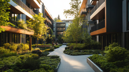 Sunlight filters through trees in a modern residential courtyard surrounded by stylish apartments. Lush plants and a winding pathway create a tranquil atmosphere