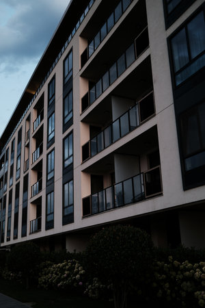 Newly built condominiums. Stylish exterior apartment photographed in a minimalist style.