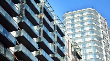 Contemporary building facade, modern architectural design in an urban setting. Modern residential architecture in Canada in summer. Exterior Abstract futuristic background.