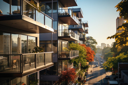 A stunning modern apartment building bathed in sunlight, showcasing large glass windows and a beautiful landscape. Perfect for urban living and tranquility.