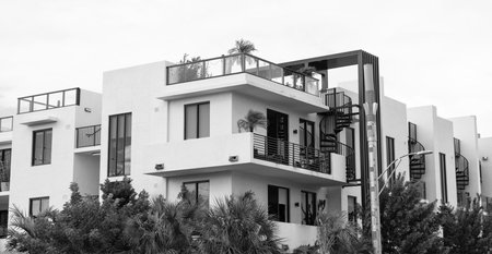 Contemporary apartment building. Generic residential architecture. Black and white.