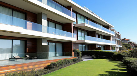 Stunning modern residential building featuring elegant glass balconies and a lush lawn, ideal for showcasing contemporary design under bright blue skies.
