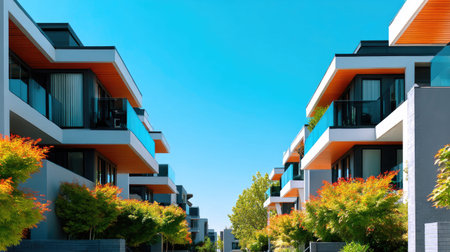 Bright and inviting modern residential buildings showcase contemporary design with lush greenery and vibrant colors against a cloudless sky, embodying urban living.