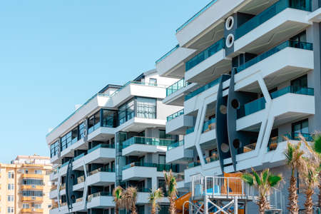 Apartment building with balconies and palm trees. View of building. Residential building architecture. Architectural exterior. House exterior fragment. Modern apartment building. Summer vacation