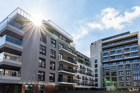 Modern apartment buildings on a sunny day with a blue sky. Facade of a modern apartment building