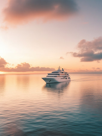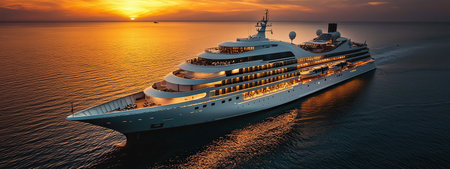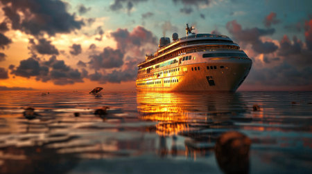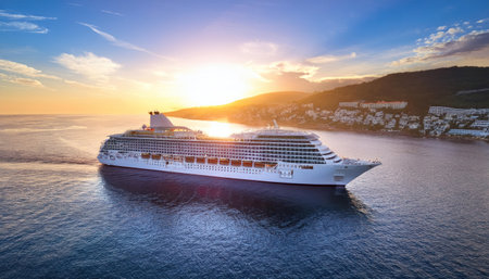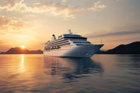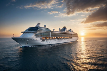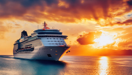 A luxury cruise ship sails through calm waters against a breathtaking sunset sky, offering a sense of grand travel adventures