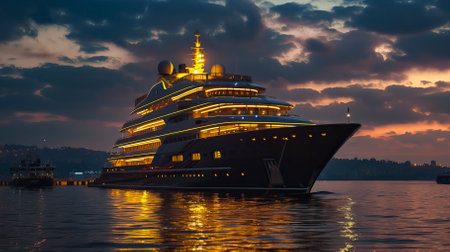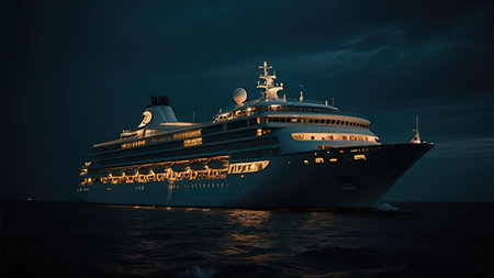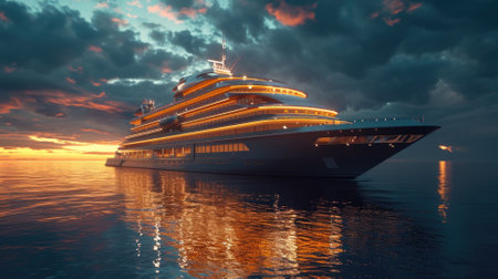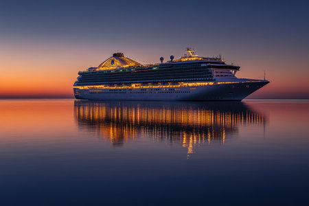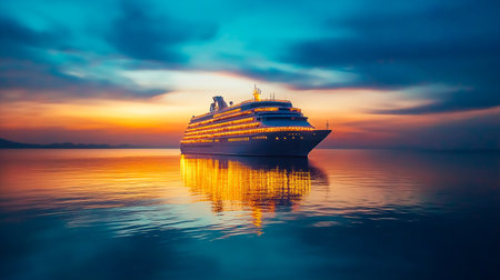 A magnificent cruise ship glows against a twilight sky, its reflections shimmering on tranquil waters. It embodies luxury and adventure, ideal for unforgettable, restful sea journeys