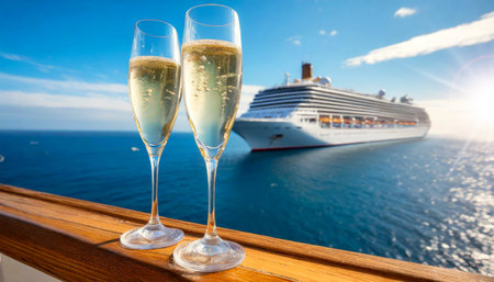 Extreme closeup of two champagne flutes glasses on a wooden railing of a cruise ship, on background a beautiful blue seascape with a white large cruise ship, blue clear sky and sunbeams. Generative Ai