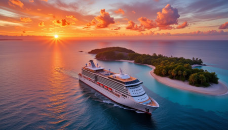 Luxurious cruise ship sailing at sunset near tropical island, serene escape. generated by ai