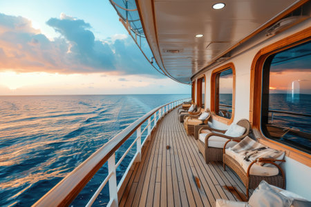 Luxurious cruise ship is sailing on calm sea at sunset creating a magical atmosphere