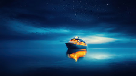 A large cruise ship illuminates the dark waters, creating a serene glow as it navigates the tranquil sea at night, surrounded by a star-filled sky enhancing the peaceful atmosphere.