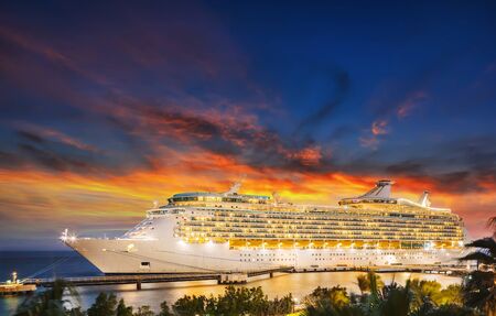 Majestic cruise ship in vacation summer. Cruise ship vacation and travel at sea. View of luxury liner. Ship leaving Miami beach port. Luxury sea vacation. Cruise ship vacation. Sunset in Florida