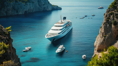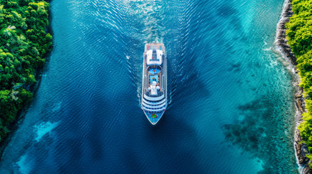 Large cruise ship in tropical landscape, aerial view. Tourism vacation and summer traveling. Luxury liner ship in the sea. Created with Generative AI