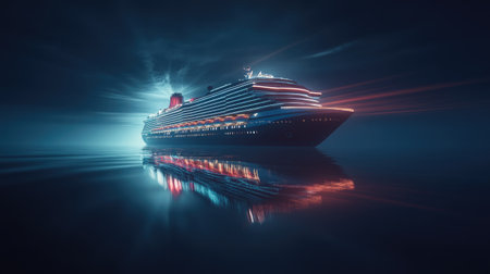 A stunning futuristic cruise ship illuminates the dark waters at night, creating a serene and mysterious atmosphere with vibrant reflections and ambient light.