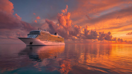A magnificent cruise ship gliding across calm waters during a vibrant sunset, showcasing dramatic clouds and serene reflections, ideal for travel and adventure themes.