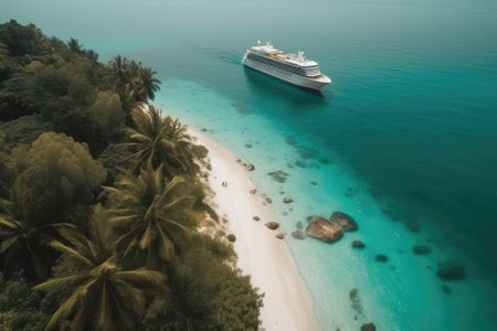 White cruise ship is docked at a tropical island paradise with palm trees, white sandy beaches, and turquoise water, creating a luxurious and relaxing vacation getaway