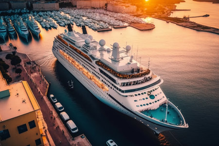 At the harbor, a magnificent cruise ship graces the scene with its presence. Captured from an aerial perspective during sunset, the large white ship against the colorful landscape, surrounded by boats in the marina bay. Generative AI.