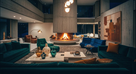 Interior design of Living Room in Contemporary style with Fireplace decorated with Velvet, Wood, Leather material. Modern architecture. Generative AI AIG24.