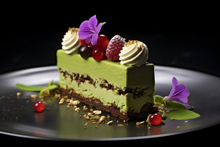 Matcha-flavored fresh cake on a plate decorated with flowers and berries