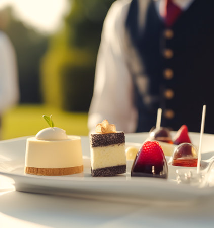 Luxury food service, desserts by a waiter at a wedding celebration or formal event in classic English style at luxurious hotel or country estate, post-processed, generative ai