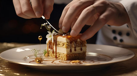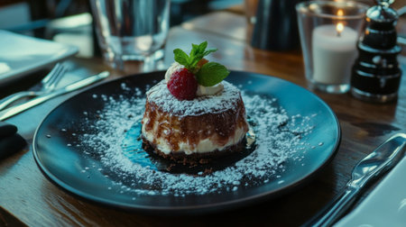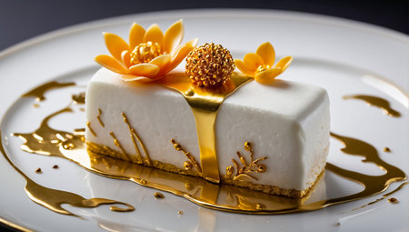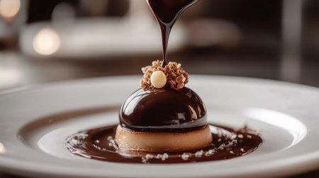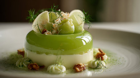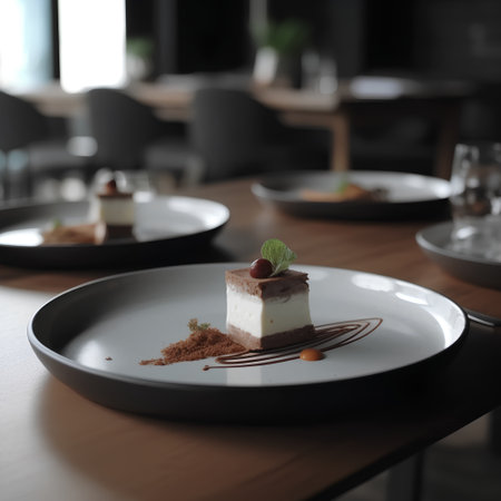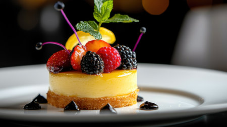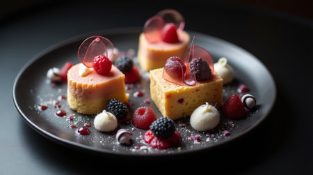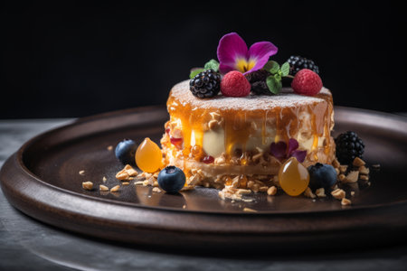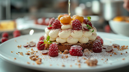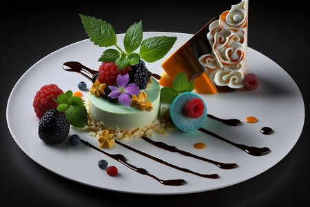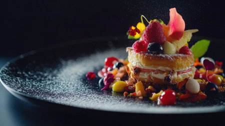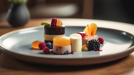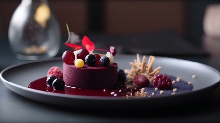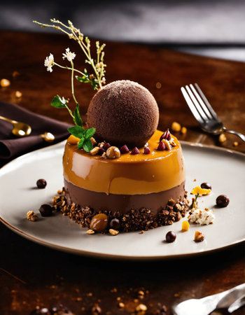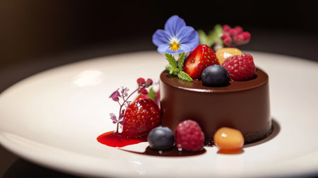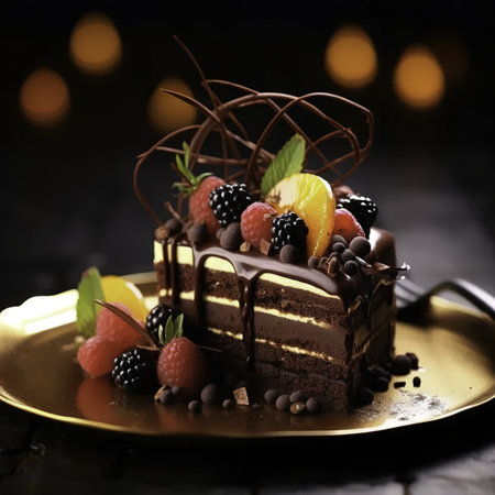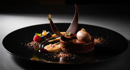 A luxurious dessert with layers of chocolate, fruit, and cream, perfectly plated on a sleek dish, with soft lighting enhancing the artistic details